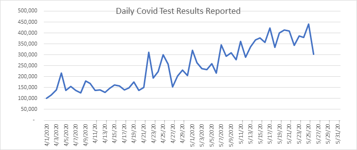 Here are the daily reported tests. A drop in tests today, but still over 300,000, and the positive rate once again came in very low, at 5%. Total reported tests now stand at about 15 million.