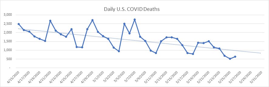 First, the progress on daily deaths is looking good. I changed the graph so it begins with the IHME projection of peak daily deaths on April 15 so I can show a trend line from the peak. Why, you might ask, does my graph show the peak deaths on May 7th. The reason is that IHME adjusts the deaths to date of death, and I show the date of reporting. As many states went through the process of reclassifying historical deaths as COVID, they were reported in many cases well after the date of death. I don’t have the resources to do this, so I just report when they are reported. Clear as mud, right? The takeaway is that even with inconsistent reporting, we’re still showing a steady decline. Good news.