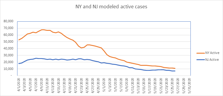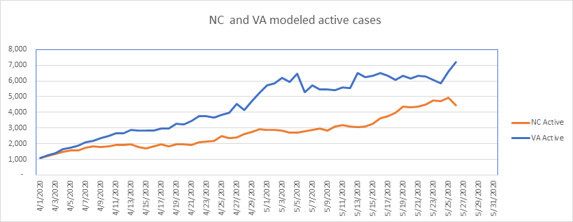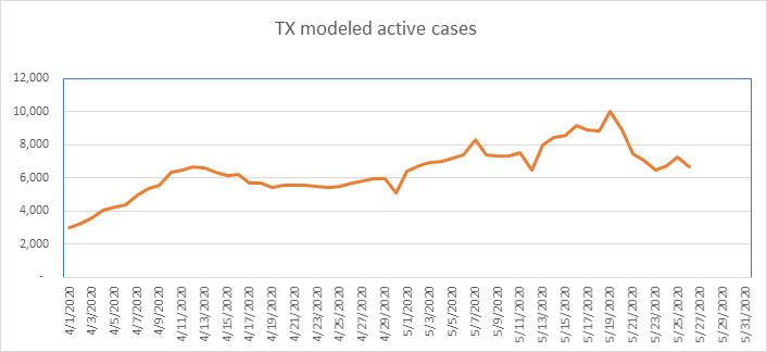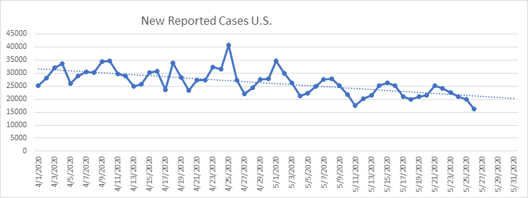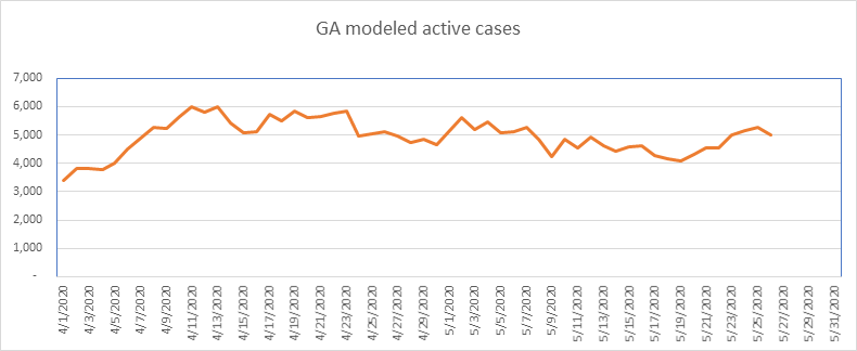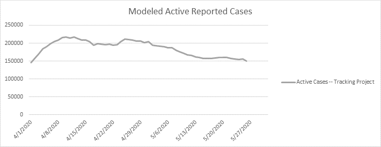 Here is the national picture of active cases – another decline today down to 150,000. We’re down 31% from the peak. I projected a few weeks ago that we’d be down 50% by the end of May. With the issues in CA and VA we might not make it, but we’re heading there. I now model known active cases at a tiny sliver of the U.S. population – about 0.044%.