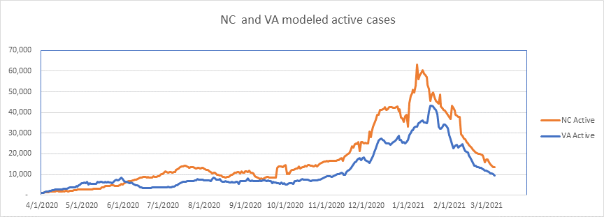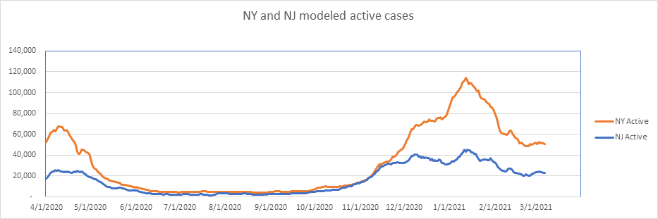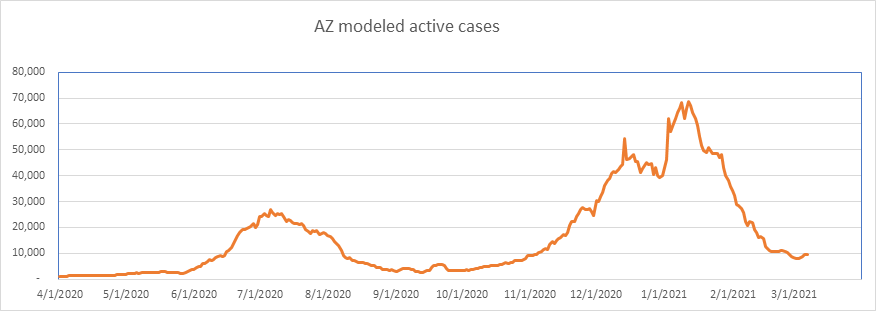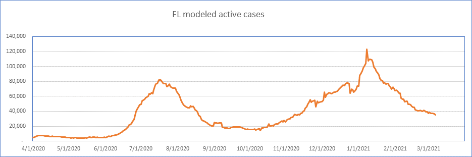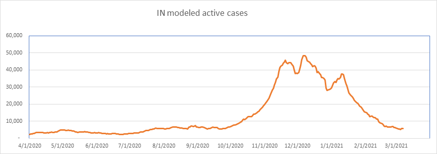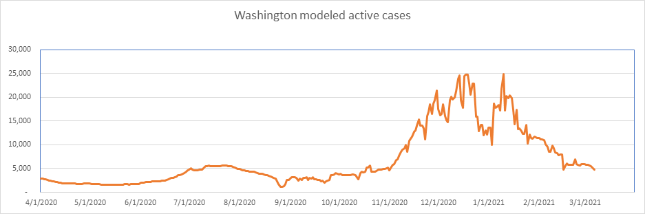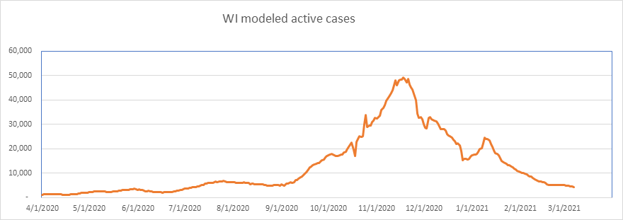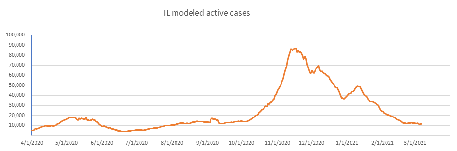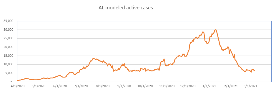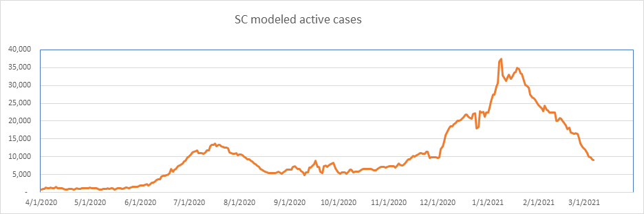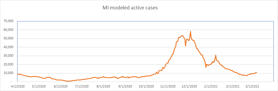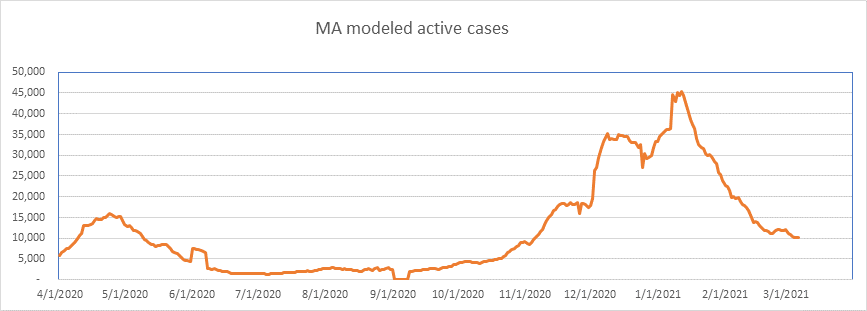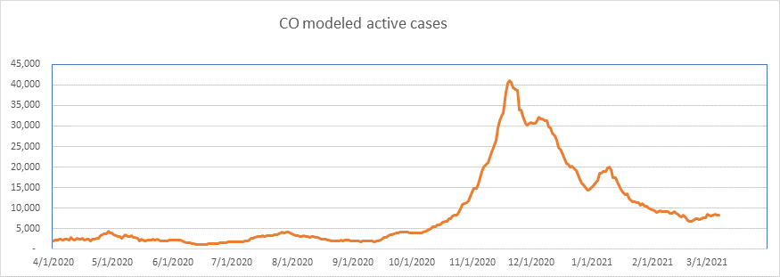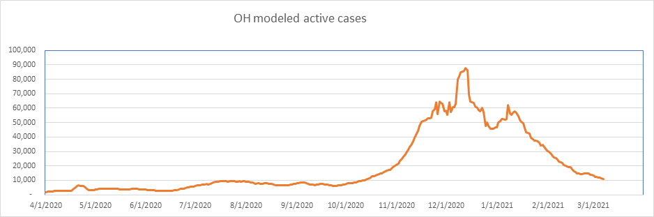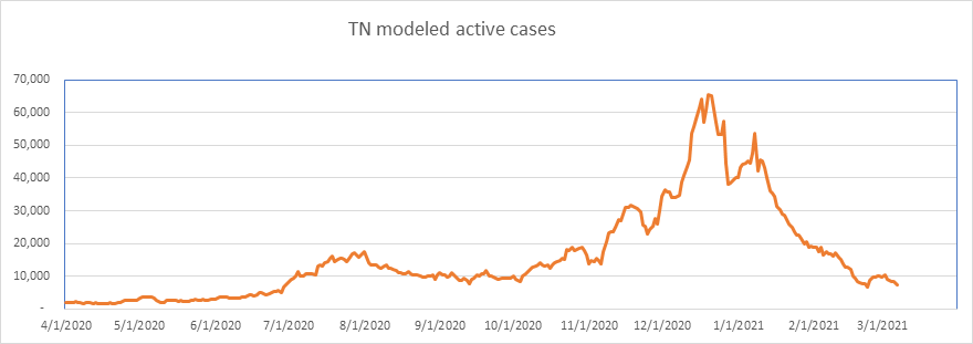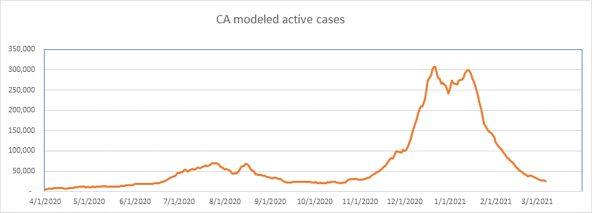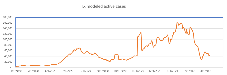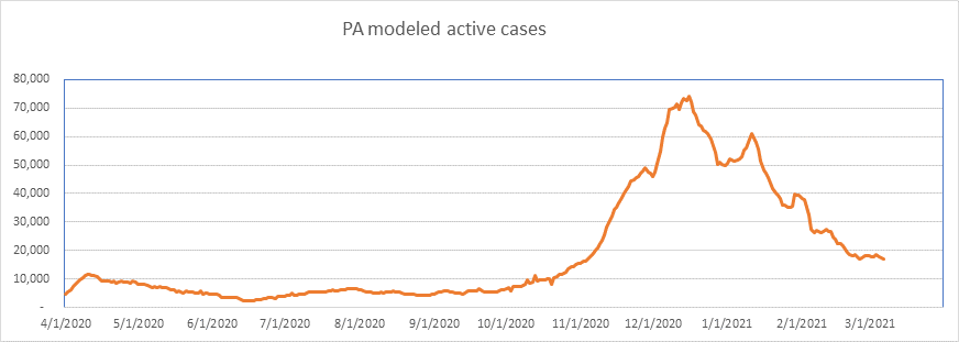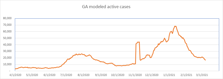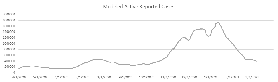 Here is the known active case count, showing 404,000 cases. We’ll be below 400,000 when all the numbers come in for today. This is a large 77% drop from the peak less than 2 months ago. We are showing some slowdown from the winter storm perturbation, but we’re past that now, and I expect the drop to accelerate from here on.
