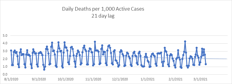 Here is the graph of daily deaths per 1,000 known active cases, still remarkably stable, and a good predicter of daily deaths over the next 3 weeks.