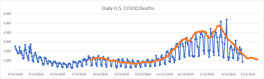 The daily death rate continues to fall rapidly, even though various states are releasing new death data from deaths occurring in last December and January. This muddies things a bit, so the actual contemporaneous death counts are actually lower than the data I’m using. Here is a report from Virginia that illustrates this: Virginia has reported nearly 1,600 COVID deaths in past 10 days. Most are from December and January. | Richmond Local News | richmond.com