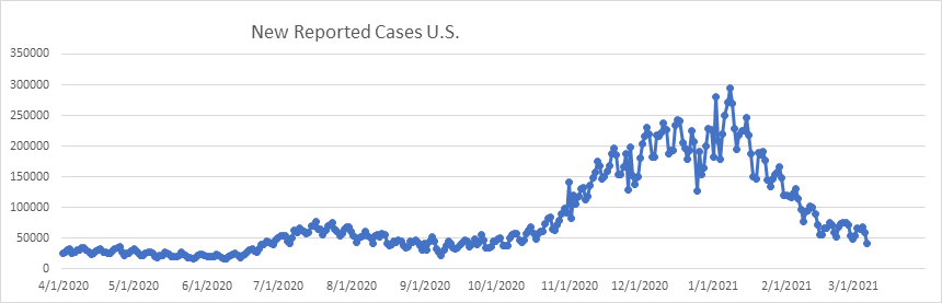 Here is the graph of daily new cases. We had about 41,000 new cases yesterday – the lowest daily number we’ve seen since early October 2020. Looking at early reports, today’s numbers look like they’ll come in about 39,000.